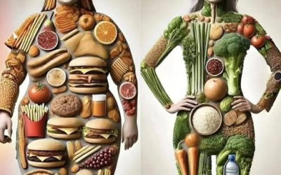 Na zdjęciu widoczny jest uderzający kontrast: z jednej strony dieta bogata w produkty wysoko przetworzone (fast food, potrawy smażone, ciastka),…